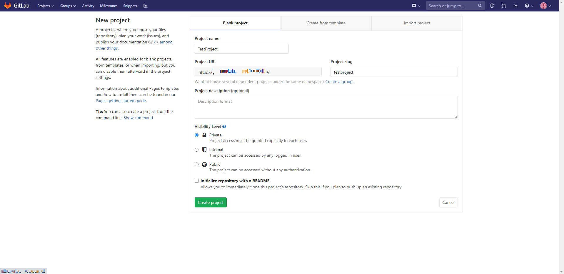 3. Blank Project -> Project name : TestProject -> Private 설정 -> Create Project 를 클릭한다.